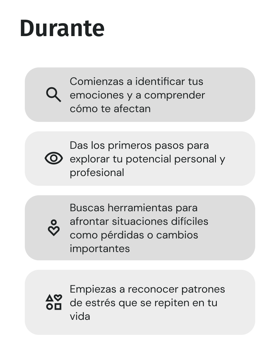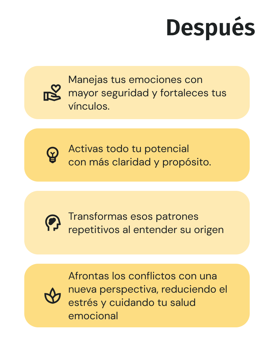 Ahora tengo una perspectiva completamente diferente sobre mis conflictos y herramientas claras para afrontarlos. Es una experiencia que definitivamente marcó un antes y un después en mi bienestar