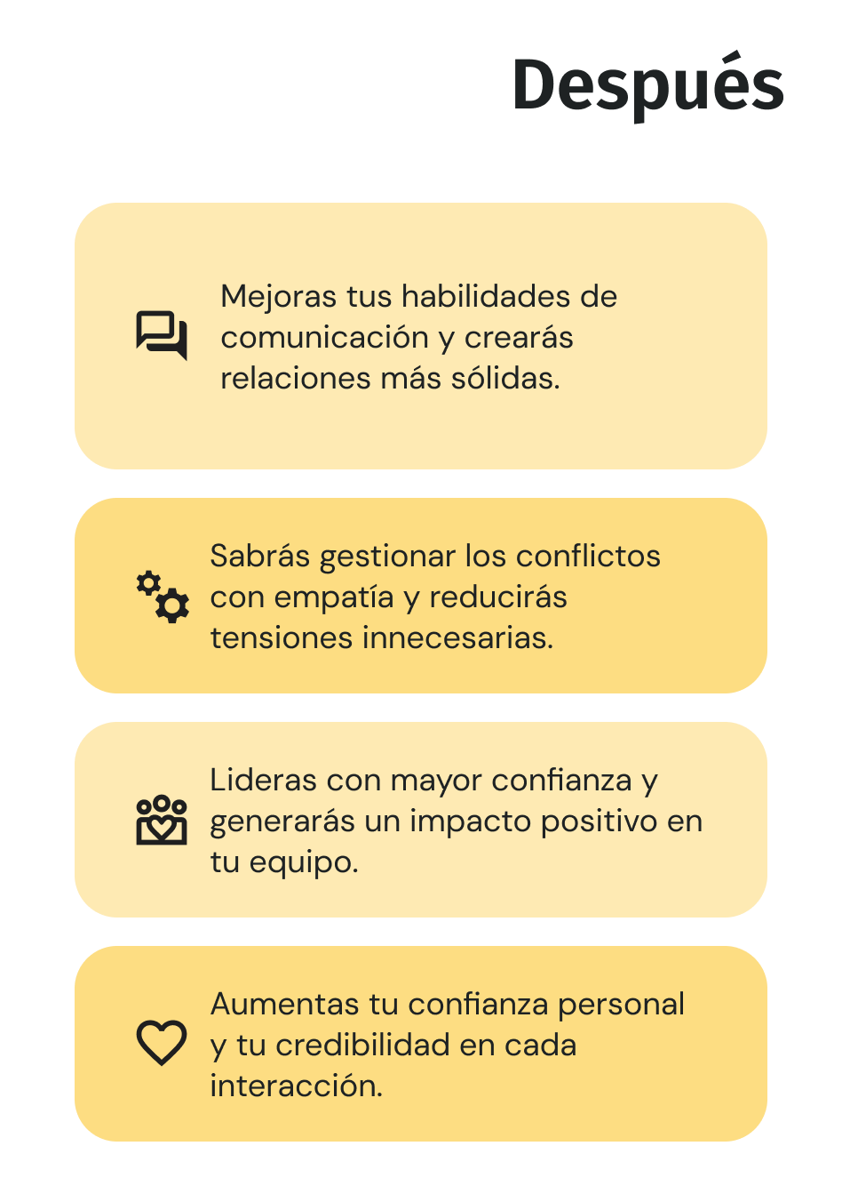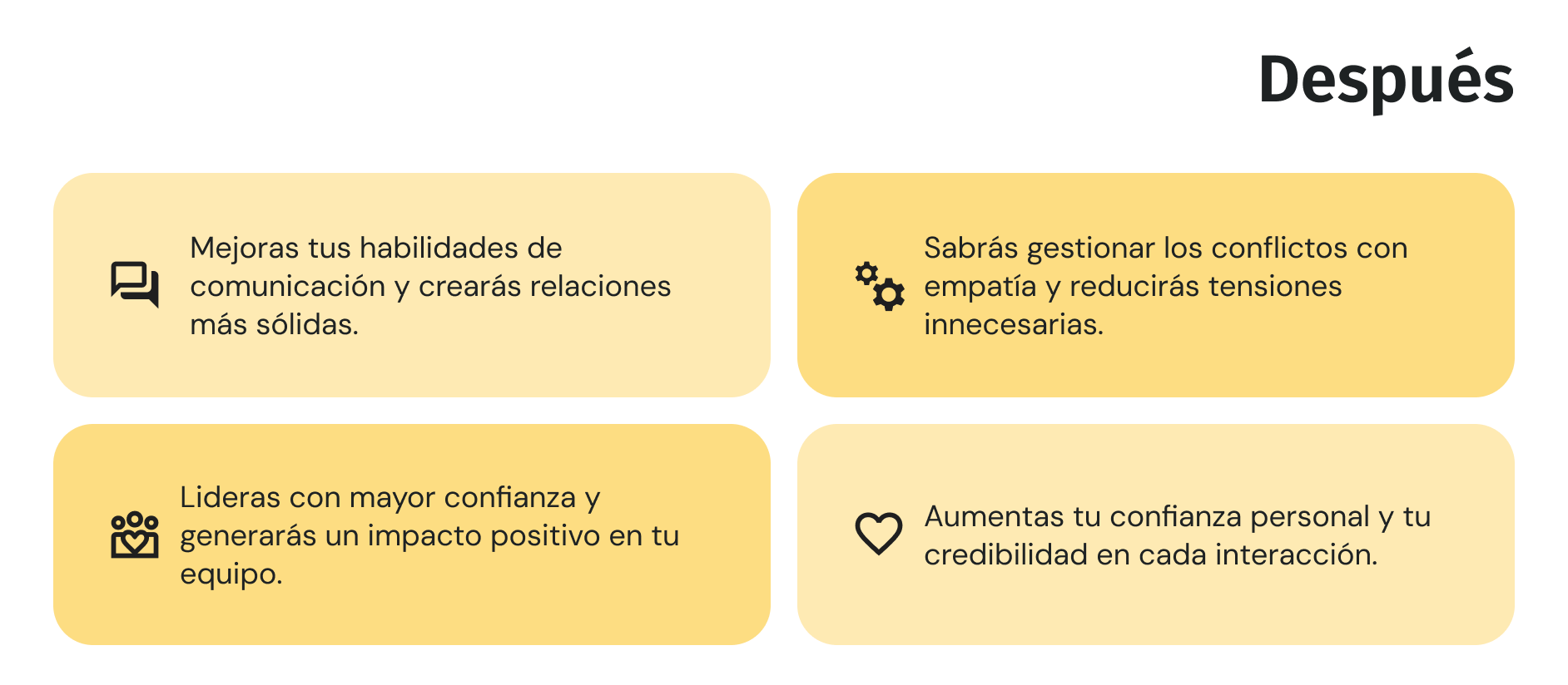Este workshop transformó mi forma de liderar. Aprendí a reconocer emociones propias y ajenas, mejorando mi comunicación y toma de decisiones. Ahora lidero con más empatía y claridad. Una experiencia poderosa que impactó directamente en mi equipo y en los resultados de la empresa.